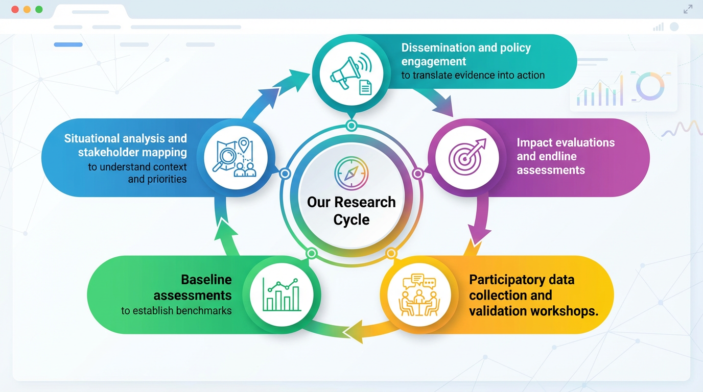 We begin by conducting a comprehensive analysis of the social, economic, and institutional context. This includes identifying key stakeholders—government institutions, community groups, civil society organisations, private sector actors, and development partners—whose engagement is essential to the research processe.